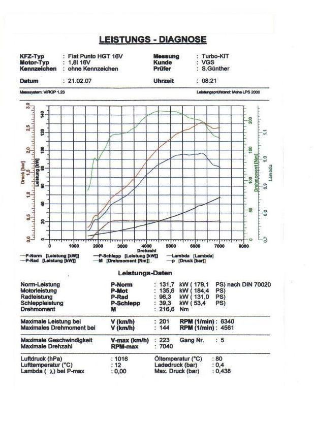 Unser Turbo-Umbaukit für den Fiat Barchetta und Punto HGTEinleitung: Dieses Kit wurde entwickelt mit dem Ziel, aus den unteren Drehzahlbereichen einen spürbaren Drehmoment-Zuwachs zu erreichen. Die maximale Leistung von 180 PS bei 6500 U/min und einem Ladedruck von 0.40 bar wurde absichtlich nicht überschritten, um die Lebensdauer sowie die Haltbarkeit sämtlicher Motorkomponenten zu schonen. Ebenso wurde versucht, das Kit mit möglichst wenig Änderungen an Motor und Fahrzeug herzustellen, um die notwendigen Kosten so gering wie möglich zu halten. Es wurde gänzlich auf Motormodifikationen wie zum Beispiel Verdichtungs-änderung verzichtet. Wir geben Ihnen hier eine Aufstellung der Teile, die unser Turbo-Kit beinhaltet (*alle Teile sind Neu-Teile bzw. hergestellt).
